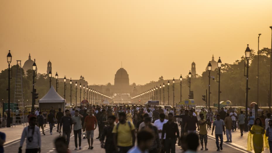 사람들이 2023년 4월 18일 화요일 인도 뉴델리에서 이른 저녁에 Kartavya Path를 방문합니다. 4월 19일에 발표된 UN 데이터에 따르면 인도는 중국을 제치고 세계에서 가장 인구가 많은 국가가 되었습니다. 사진: Prashanth Vishwanathan/Bloomberg via 게티 이미지