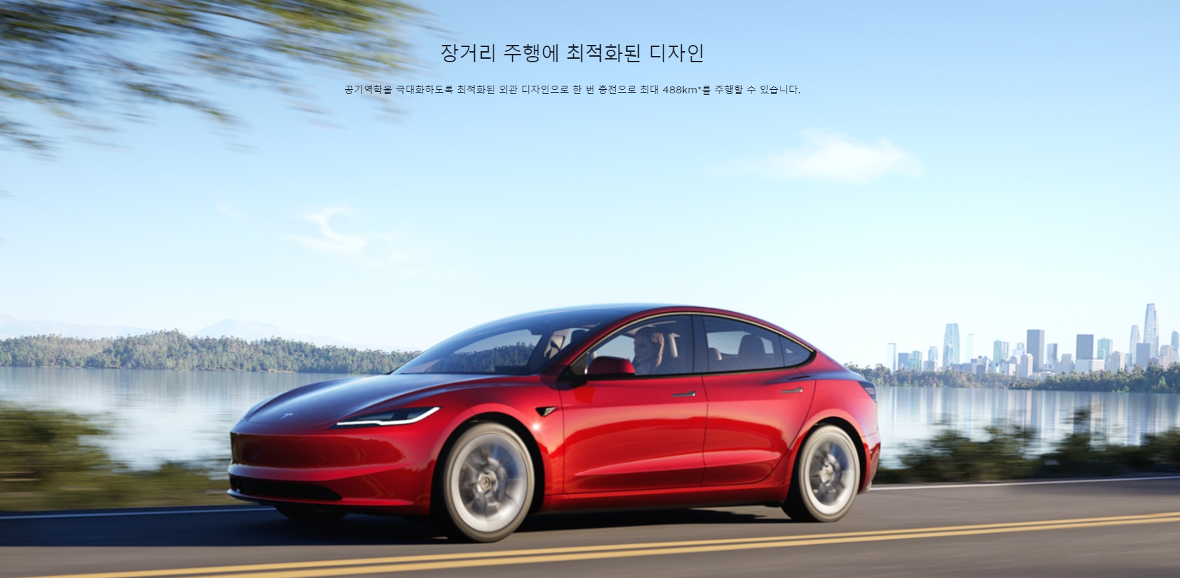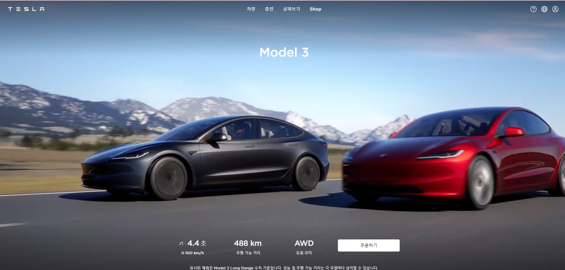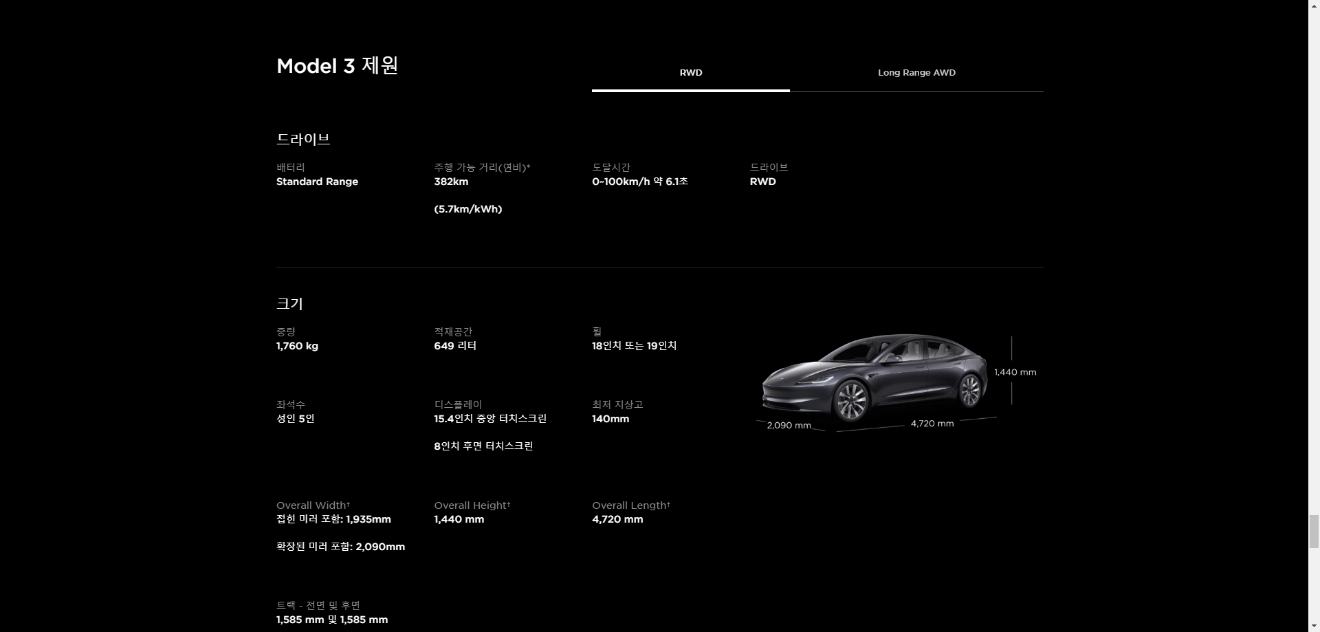 표시된 제원은 Model 3 Long Range 수치 기준입니다. 성능 및 주행 가능 거리는 각 모델마다 상이할 수 있습니다.