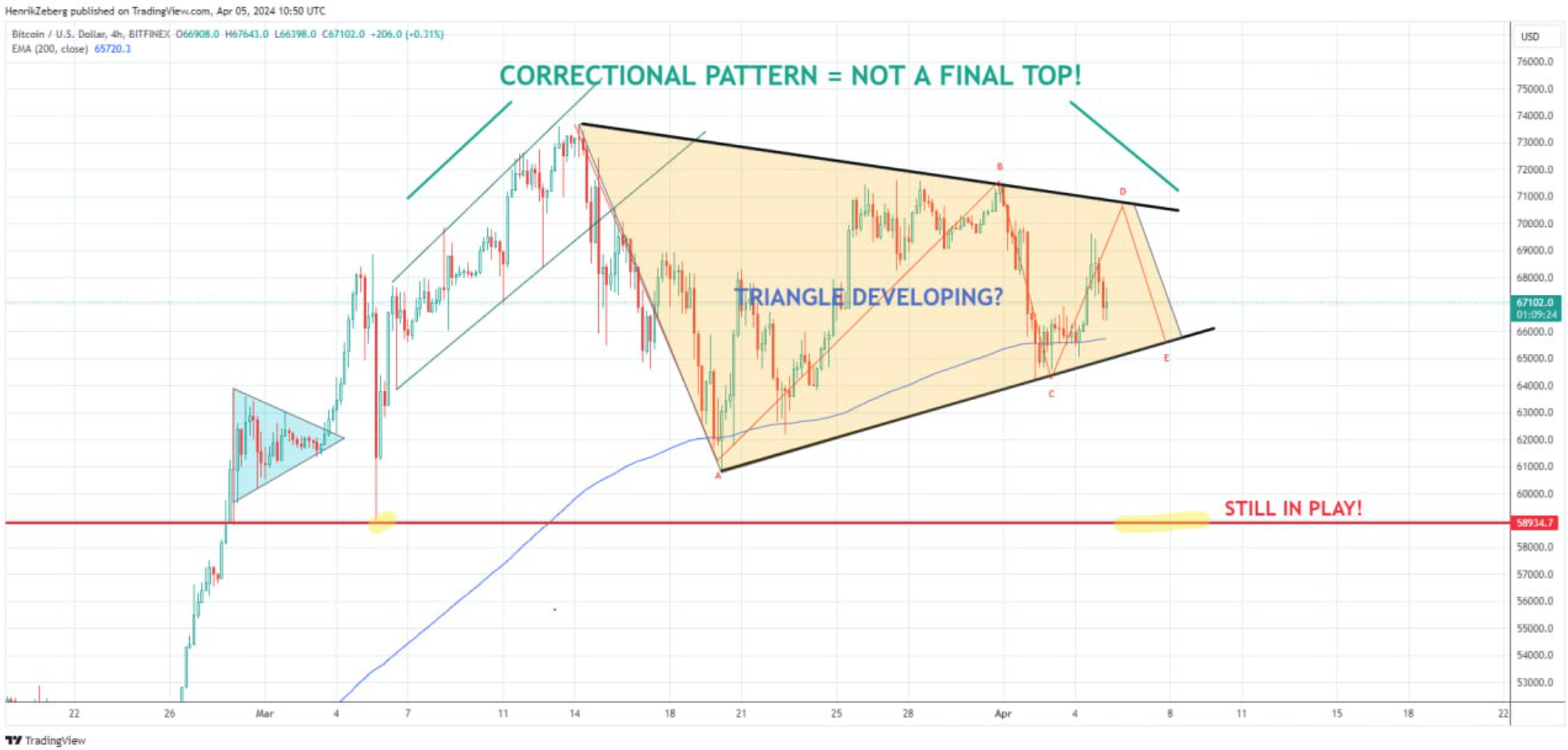 네겐트로픽(Negentropic)이라는 X(구 트위터) ID를 공유하고 있는 글래스노드 공동 창업자 얀 하펠(Jan Happel)과 얀 알레만(Yann Allemann)이 “최근 24시간 동안 BTC 가격 변동으로 4시간봉 기준 삼각수렴패턴이 형성되고 있다. 이는 BTC 상승 가능성이 높다는 것을 시사한다. 아울러 기술적 분석상 현재는 조정 구간에 있는 것으로 보인다"고 전했다.