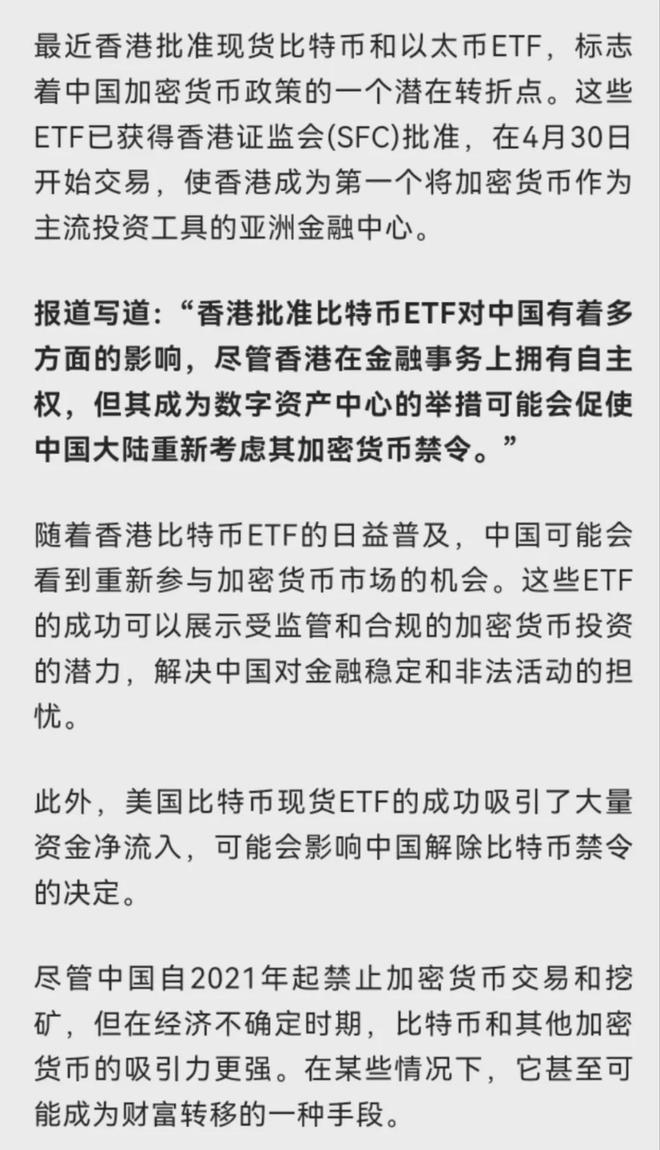 X168 파이낸셜 뉴스(아시아 태평양) 뉴스 다수의 외신과 암호화폐 커뮤니티는 전문가들을 인용해 중국이 3개월 이내에 비트코인을 철회하고 암호화폐에 대한 금지를 철회할 것으로 예상했다. 중국은 이전에 금융 위험과 환경 문제로 인해 암호화폐를 금지했지만 홍콩이 비트코인 ETF를 승인함에 따라 금지가 해제될 수 있습니다. 싱가포르 국립대학교의 벤 차로엔웡(Ben Charoenwong) 연구원은 자본 흐름이 통제 불능 상태라고 말했다.
