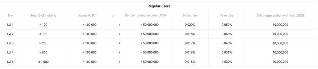 일반 사용자의 경우 수수료 등급은 총 OKB 보유량에 따라 다릅니다. 수수료는 거래 쌍, OKB 보유량, 거래량 및 거래에서 메이커 또는 테이커로서의 역할에 따라 다릅니다. 다음은 일반 사용자를 위한 수수료 구조에 대한 분석입니다.